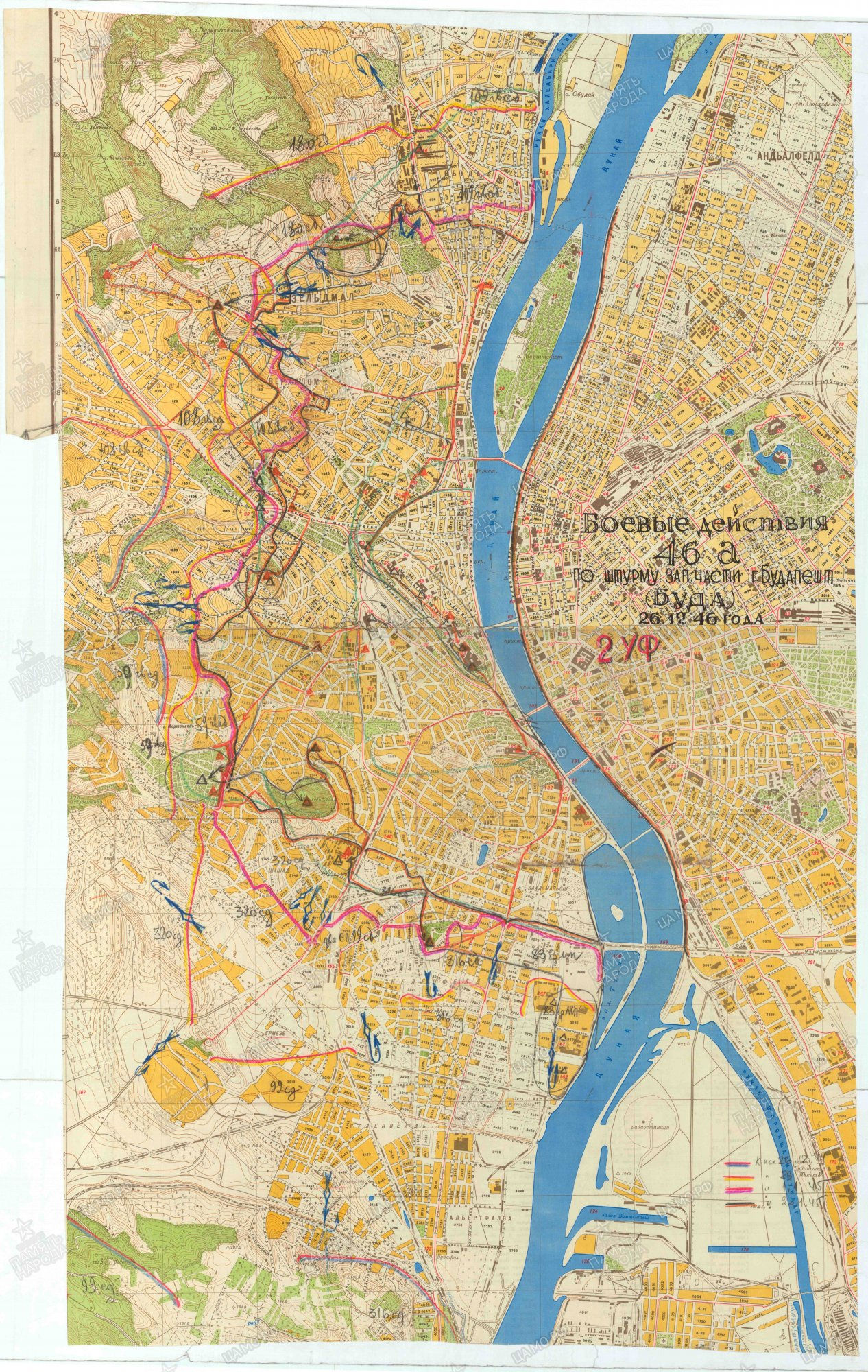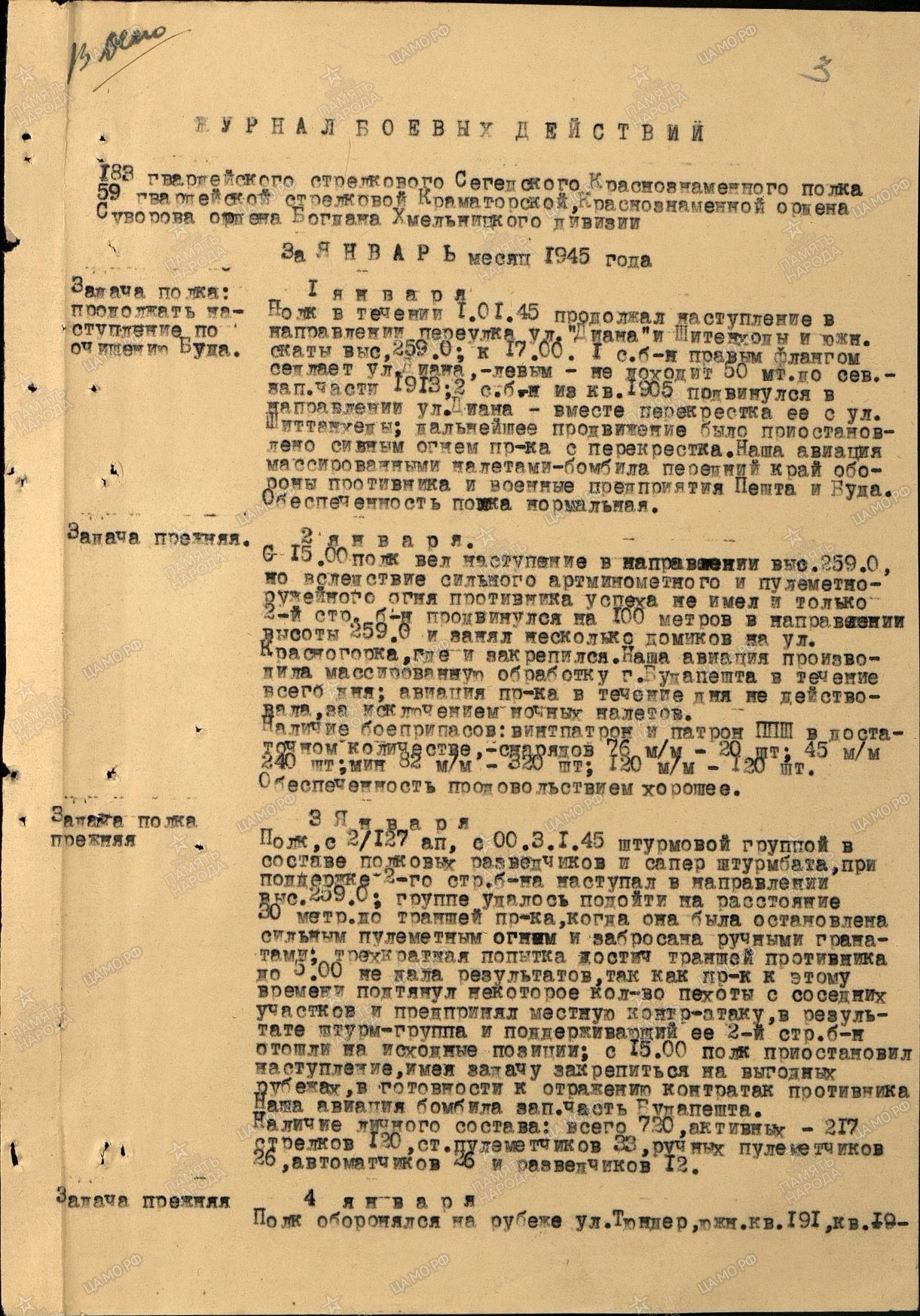 Из журнала боевых действий: «1 января. Полк в течение 1.01.45. продолжал наступление в направлении переулка ул. Диана и Шитенходы и южн. скаты выс. 259,0. К 17.00 I с. б-он (стрелковый батальон) правым флангом седлает ул. Диана, - левым – не доходит 50 м до сев. зап. части 1913; 2 стрелковый батальон из квартала 1905 продвинулся в направлении ул. Диана – в месте перекрестка ее с ул. Шиттанхеды; дальнейшее продвижение было приостановлено сильным огнем противника с перекрестка. Наша авиация массированными налетами бомбила передний край обороны противника и военные предприятия Пешта и Буды. Обеспеченность полка нормальная.»