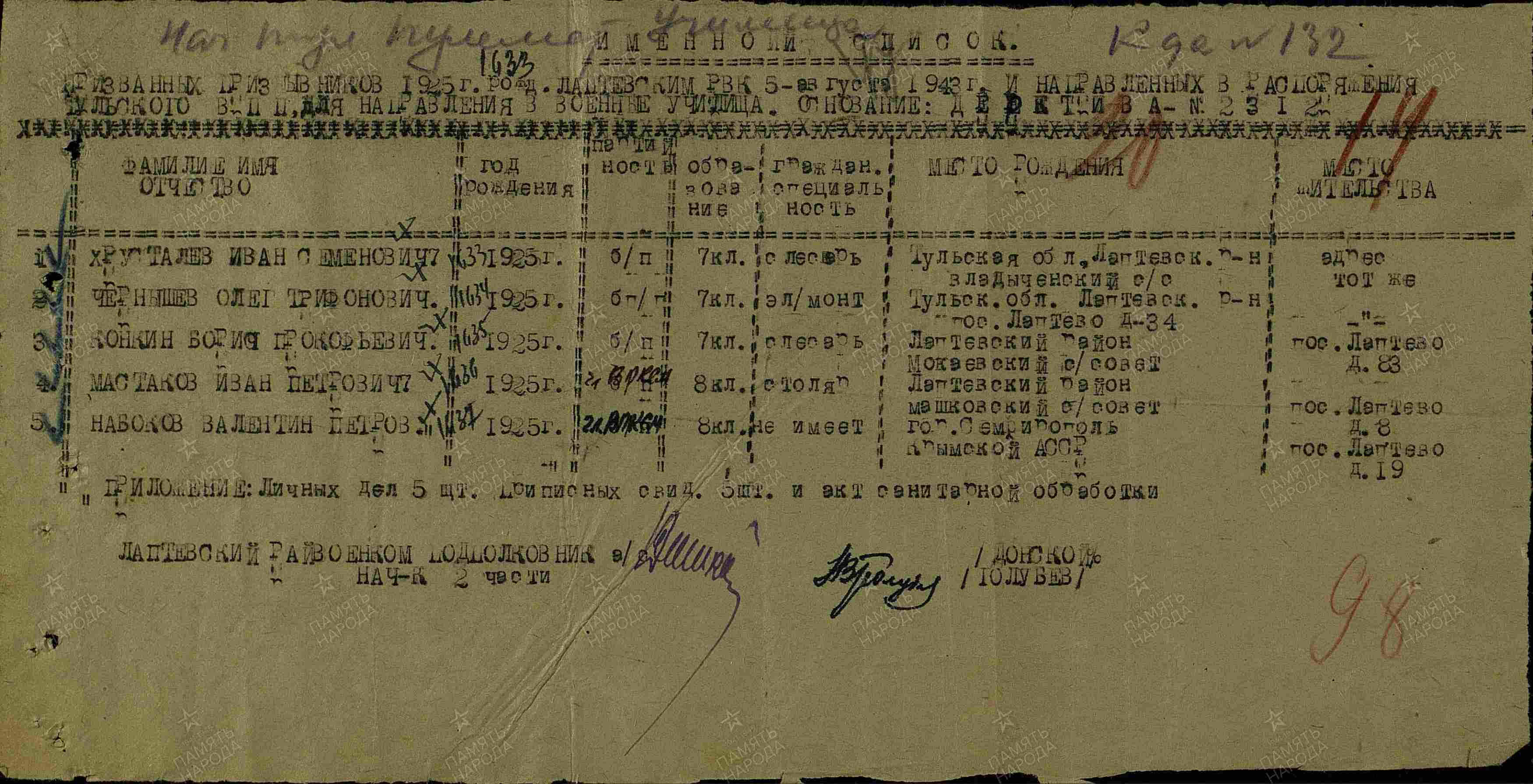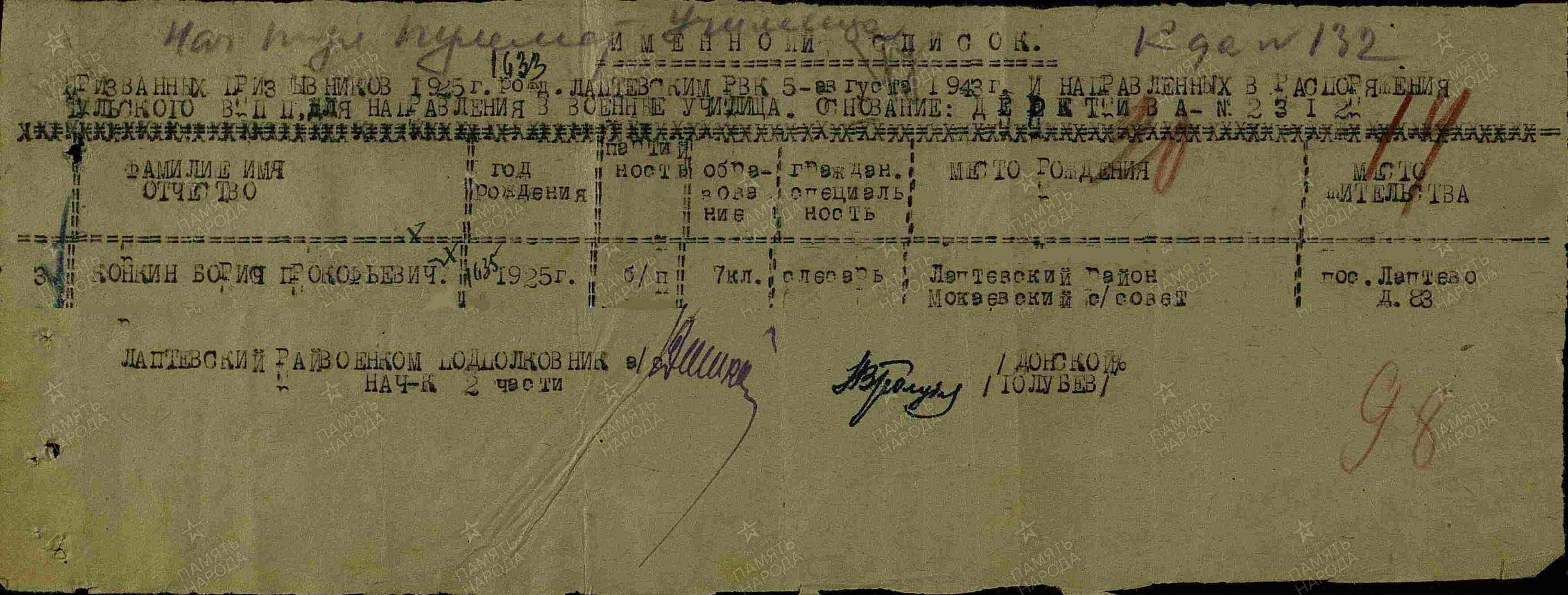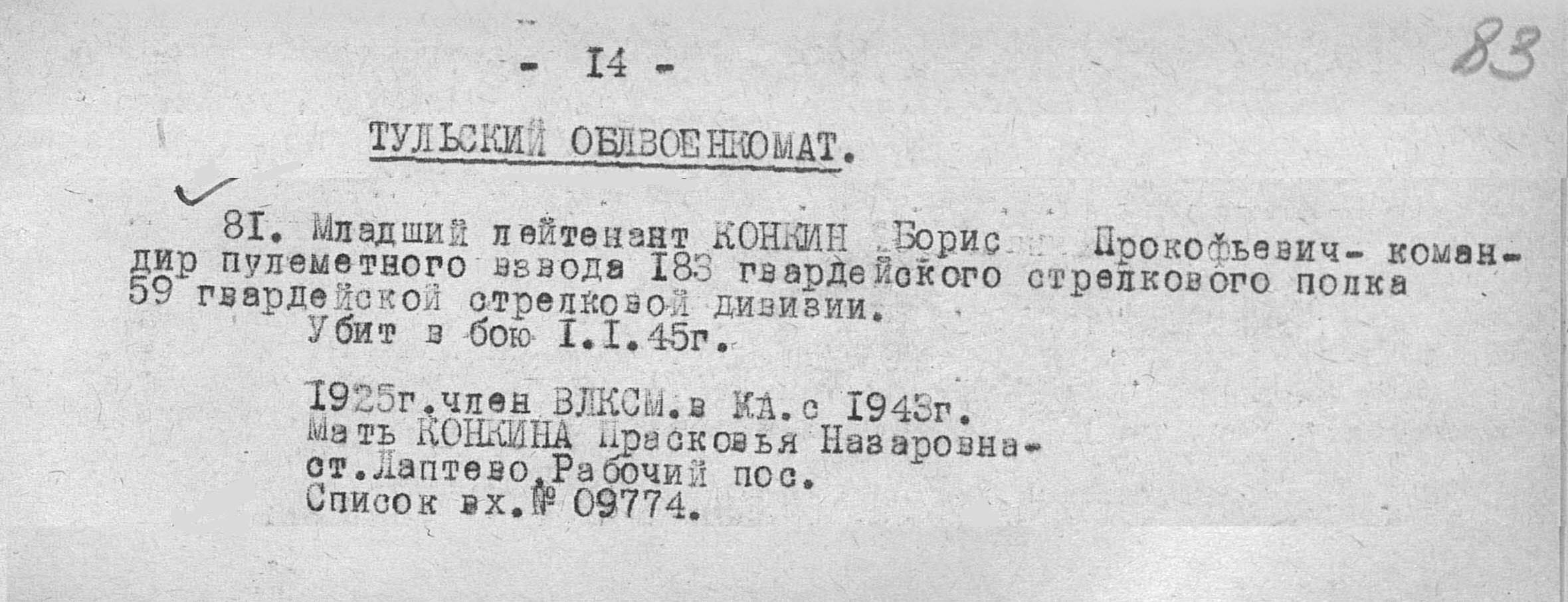 Борис Прокофьевич Конкин, младший брат нашего деда Петра Прокофьевича Конкин, родился в 1925 году в Малахово Лаптевского района в семье Прокофия Федоровича и Прасковьи Назаровны Конкиных. К началу войны успел закончить 7 классов в сельской школе. Получил рабочую профессию слесаря. Такое образование ранее было нормой, подростки овладевали всеми необходимыми знаниями и уже могли работать. Домашний адрес – поселок Лаптево, д. 83.