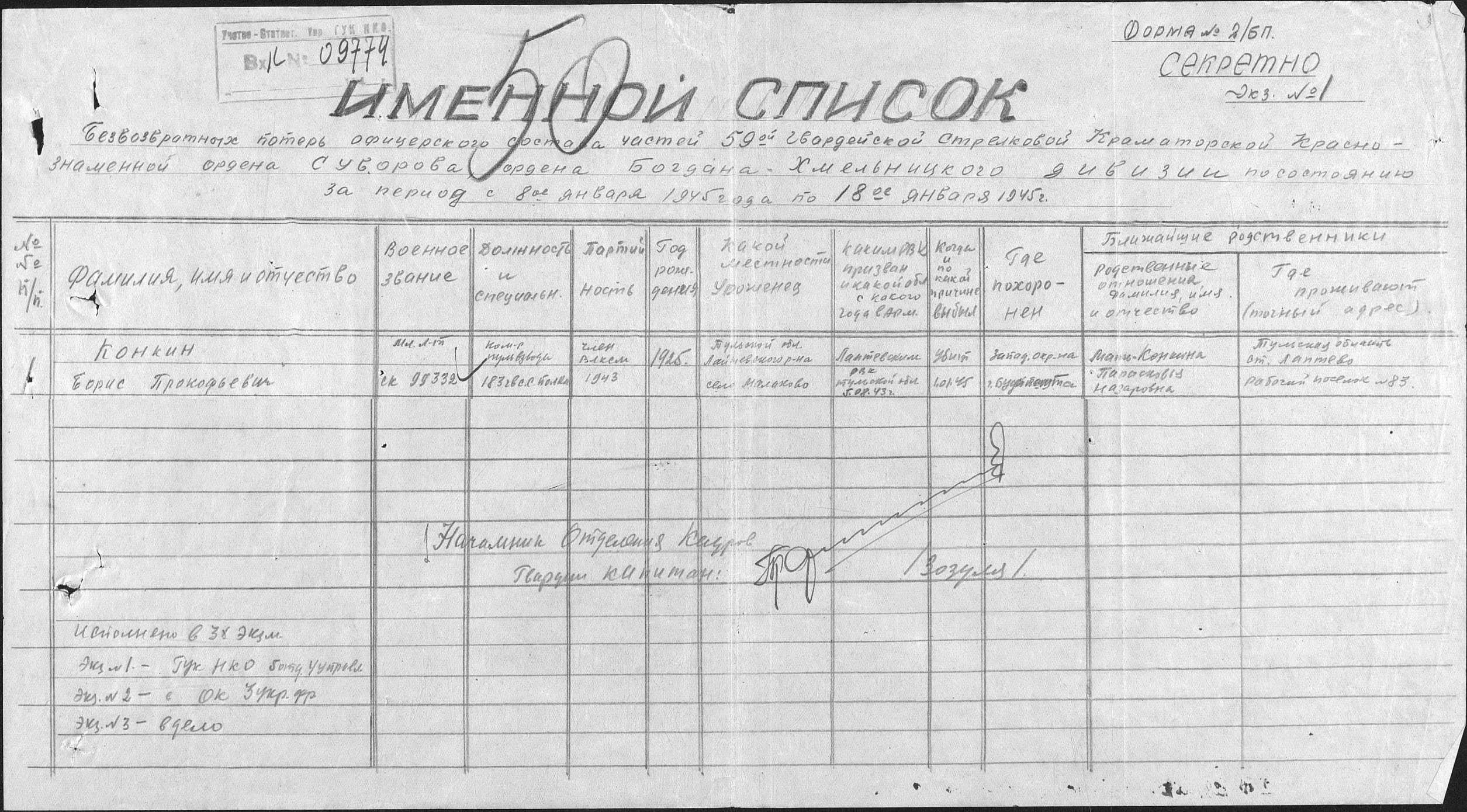 Дед наш, Петр Прокофьевич Конкин, всю жизнь искал вести о брате, обращался во всевозможные органы, но за его жизнь никакие сведения так и не появились. Правда, в 70-е годы произошла одна странная история, которую родители нам пересказывали из уст в уста. Борис пропал во время войны, вестей не было. Нужно отметить, что мать его и отец (которые умерли в начале 50-х годов) еще перед войной перебрались из Малахово в Лаптево и имели дом на улице Пролетарской. Там же впоследствии жила сестра Бориса Валентина (в замужестве – Мелкова) с семьей. Петр, старший брат, женился на Анне Георгиевне Князевой. После войны в 1947 Петру выделили участок на соседней улице Северного поселка для строительства дома.