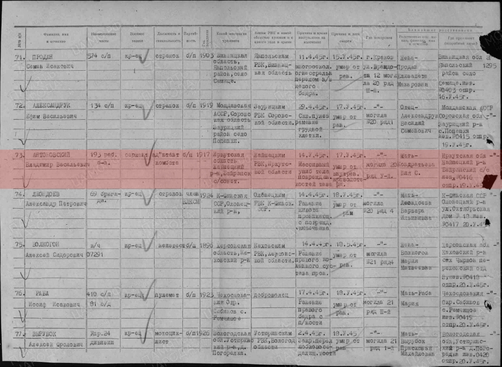 Антоновский Владимир Васильевич // Портал «Память народа». ЦАМО. 58. Оп. А-83627. Д. 2751_1. URL: https://pamyat-naroda.ru/heroes/memorial-chelovek_gospital61903379/ (дата обращения: 09.04.2018).