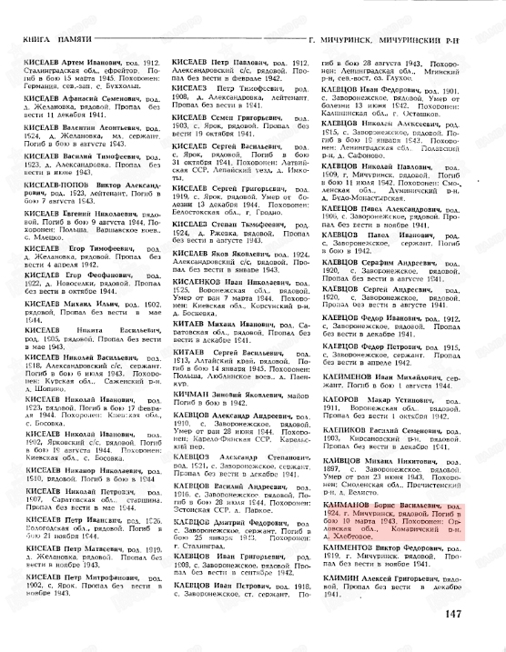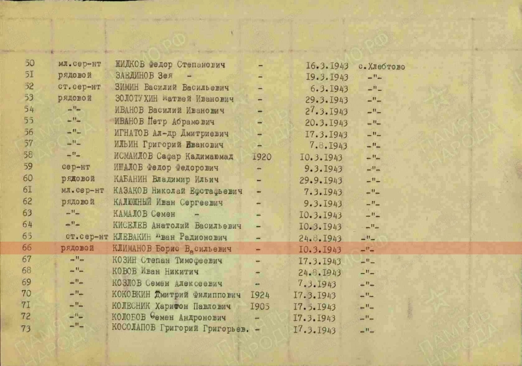 Климанов Борис Васильевич // Портал «Память народа». Списки захоронения. С. 5. № 66. URL: https://pamyat-naroda.ru/heroes/memorial-chelovek_zahoronenie260251379/ (дата обращения: 12.04.2018).