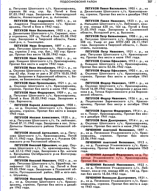 И вот 27 февраля 2016г просмотрела более 5 тысяч человек, и ни одного Аркадия Фёдоровича не нашла, стала смотреть только по фамилии и нашла в сводках и донесениях о потерях Печенкина ГЕНадия Федоровича, 1916 г.р, призванного из Кировской области, Подосиновского района, Уткановского с/с, дер. Польш-Покулеще, и меня это очень заинтересовало. Так как из опыта своей семьи знаю, как двоюродного брата моей мамы на фронте вообще живого перекрестили из Ивана в Михаила. Так он и доживал свой век Михаилом.