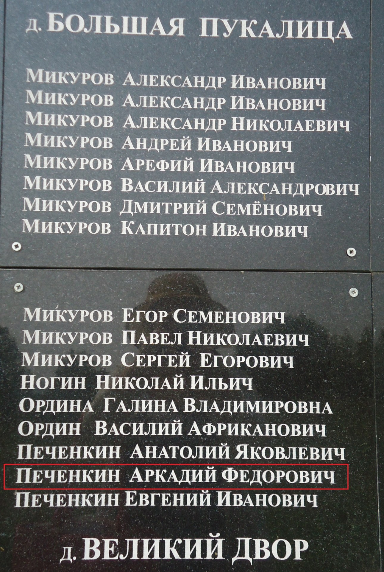 И так вышло в нашей семье, что в 1942 году пришло извещение на имя моей тети Печёнкиной Клавдии Фёдоровны, что Печёнкин Аркадий Фёдорович пропал без вести, но и это извещение пионеры унесли, когда собирали сведения о земляках, погибших на войне. И не осталось никакой весточки, никакой зацепочки…