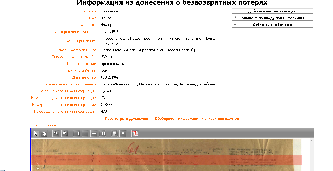 Так вот, вторая половина имени совпадала, а ошибки в написании адреса, учитывая уровень грамотности, тоже можно понять. Тем более что это сводки из Карелии, и для этого региона звучит вполне понятно, с финским акцентом. А когда начала рассматривать лист донесения, при его увеличении вполне неплохо видно имя Аркадий, год рождения совпал, и со слов тети я знала, что он погиб зимой 42 или 43 года. Вот взгляните на Информацию по донесению ОБД Мемориал