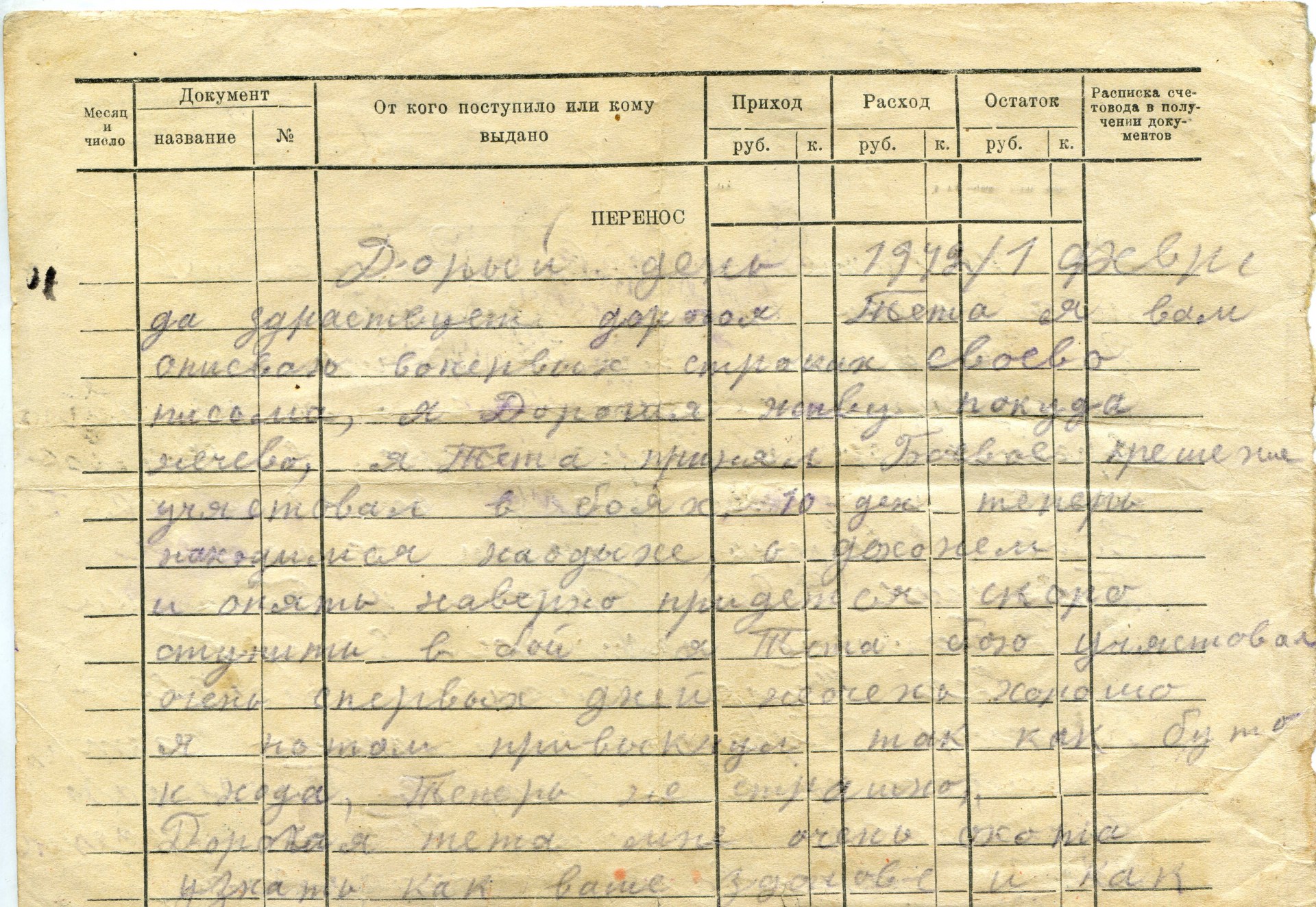 Подняла одно из писем дяди Аркаши, написанное 1 февраля 1942 г., за 5 дней до трагической гибели. Он писал своей тете Печёнкиной Анне Тимофеевне, которая жила на Лукино, а она уже потом передала это письмо Печёнкиной Клавдии Федоровне, моей тете, сестре Аркаши. Письмо очень доброе, без жалоб на трудности и невзгоды, беспокоился о тетушках и сестрах, написал, где и у кого оставил свои гражданские вещи, чего и сколько, просил забрать… Написал, что 10 декабря был страшный бой и теперь он уже ничего не боится, сейчас они на отдыхе.