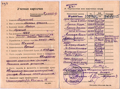 Его брат, Николай Александрович Шмельков, 1924 г.р., офицер-артиллерист, погиб в конце войны где-то в Польше. Работая в архиве, я установил боевой путь родственников, номера воинских частей, в которых они служили, их награды, смог ознакомиться с учетно-послужными документами, наградными листами и приказами. Когда заказывал документы, то часть из них была не доступна, как мне сказали, они были на оцифровке. Я получил ответы на многие свои вопросы. Но оказалось, что эти ответы порождают ещё большое количество вопросов. Я понял, что еще не один раз буду посещать Подольск, потому что полученной информации мне не хватает для воссоздания картины тех лет и получения общего понимания происходящего мне требуется информация не только по моим родственникам, но и по их сослуживцам и боевым товарищам. Мне стало интересно, кто входил в экипажи танков, какие были командиры и подчиненные. С кем мои родственники делили суровые трудности войны. Так я стал собирать информацию сначала по 7 гв. ттбр, где служил мой дед Алексей, а потом и по 31 гв. тгабр РГК, где командиром батареи служил его младший брат Николай. С первых дней появления я работал с сайтом «obd-memorial.ru», потом с «podvignaroda.ru» и, наконец, «pamyat-naroda.ru», объединивший два предыдущих ресурса. На основе собранных материалов мною созданы сайты «7бригада.рф» и «31бригада.рф», содержащие информацию по воинским частям моих родственников. На них представлены материалы по боевому пути частей и личному составу, фотоматериалы, как полученные от родственников однополчан, так и найденные на просторах интернета. Особое место занимают материалы по личному составу бригад, основная часть которых получена с помощью ваших электронных ресурсов. В настоящее время на них представлена информация более чем на 500 человек. Ведётся общение и обмен информацией с родственниками сослуживцев.