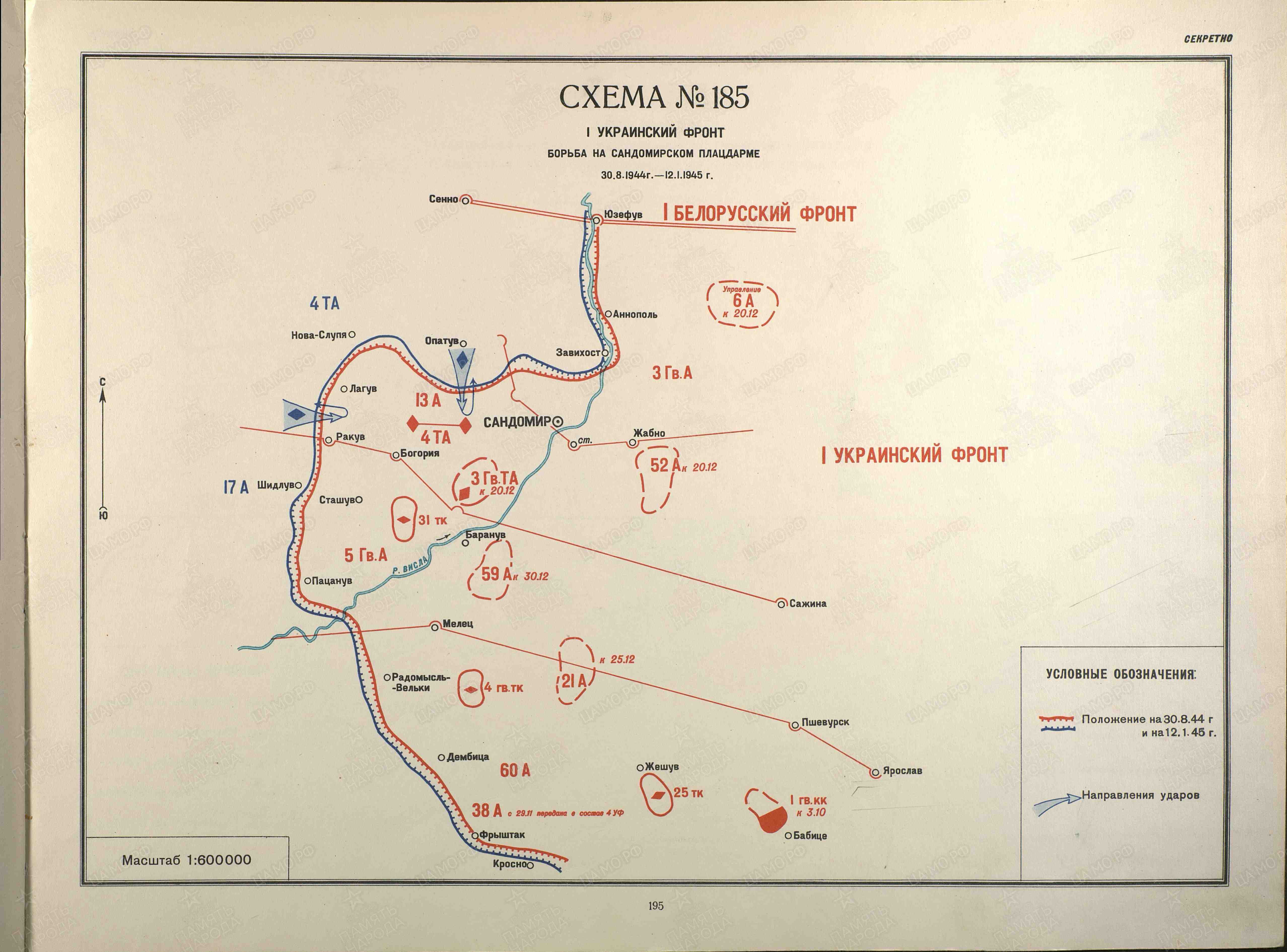 В ходе боев 29-31 июля войска 13-й армии (генерал-лейтенант Н. П. Пухов), 1-й (генерал-полковник танковых войск М. Е. Катуков) и 3-й (генерал-лейтенант П. С. Рыбалко) гвардейских танковых армий и конно-механизированной группы Соколова смогли форсировать Вислу и захватить плацдармы южнее и севернее Сандомира.