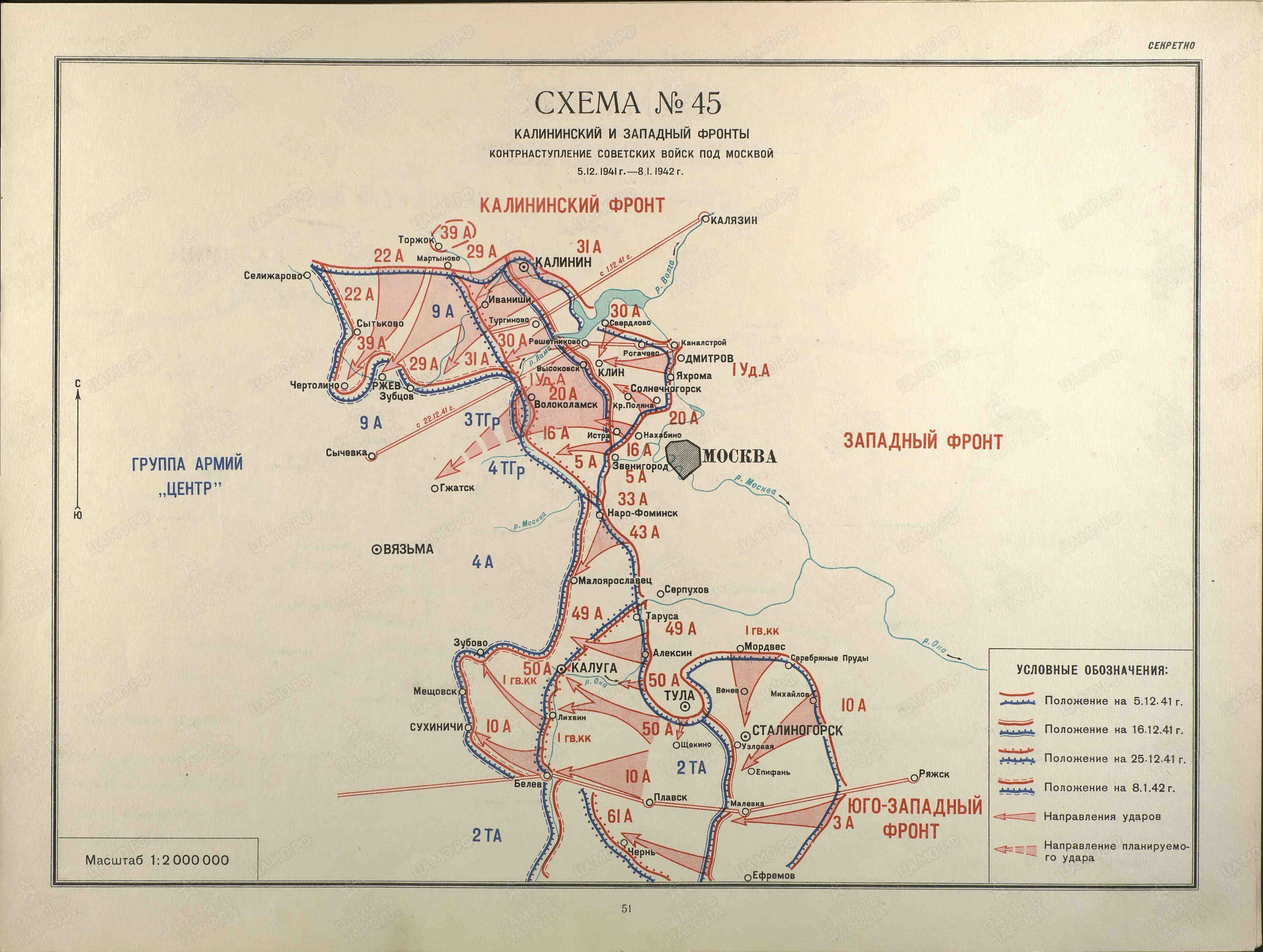 5 декабря 1941 года войска Калининского фронта под командованием генерал-полковника Конева перешли в контрнаступление. 6 декабря 1941 года к операции подключились силы Западного (генерал армии Г.К. Жукова) и Юго-Западного (маршал С.К. Тимошенко) фронтов. Несмотря на то, что скрыть приготовления к контрудару полностью не удалось, советское наступление застало немецкое военное руководство врасплох. Хотя командование группы армий «Центр» и получало донесения разведки о перегруппировке советских армий, оно не верило в возможность серьезного наступления в силу недостаточной численности наших войск в зоне соприкосновения. К концу первой недели декабря 1941 года советское наступление развернулось на калининском, клинском, солнечногорском, истринском, тульском и елецком направлениях.