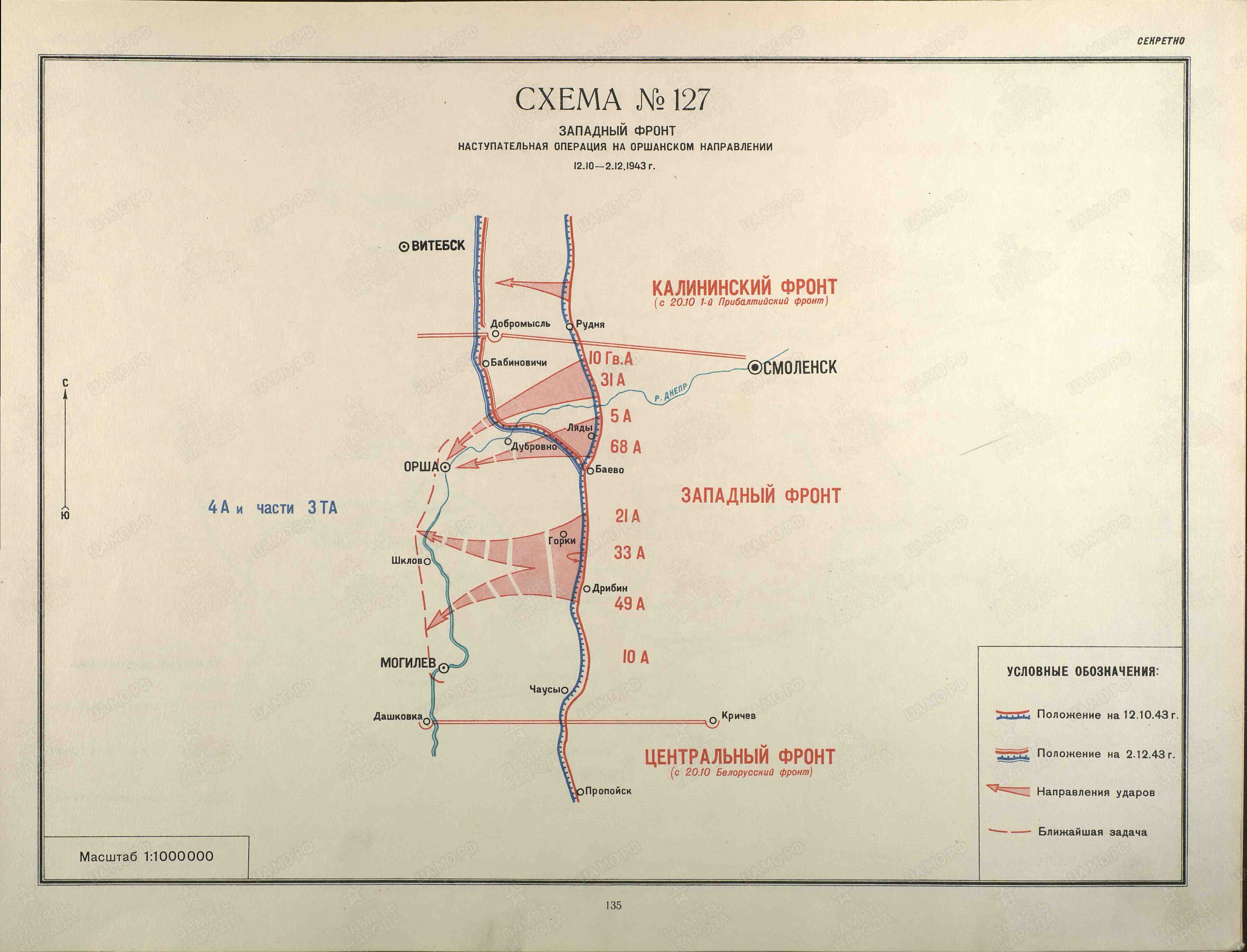В ходе операции наступление предпринималось четыре раза: 1-е - с 12.10 по 18.10.43 г.; 2-е - с 21.10 по 26.10.43 г.; 3-е - с 14.11 по 19.11.43 г.; 4-е - с 30.11 по 2.12.43 г. В результате наступления войска фронта вышли на рубеж Бабиновичи, восточнее Дубровно, Баево, продвинувшись до 30 км