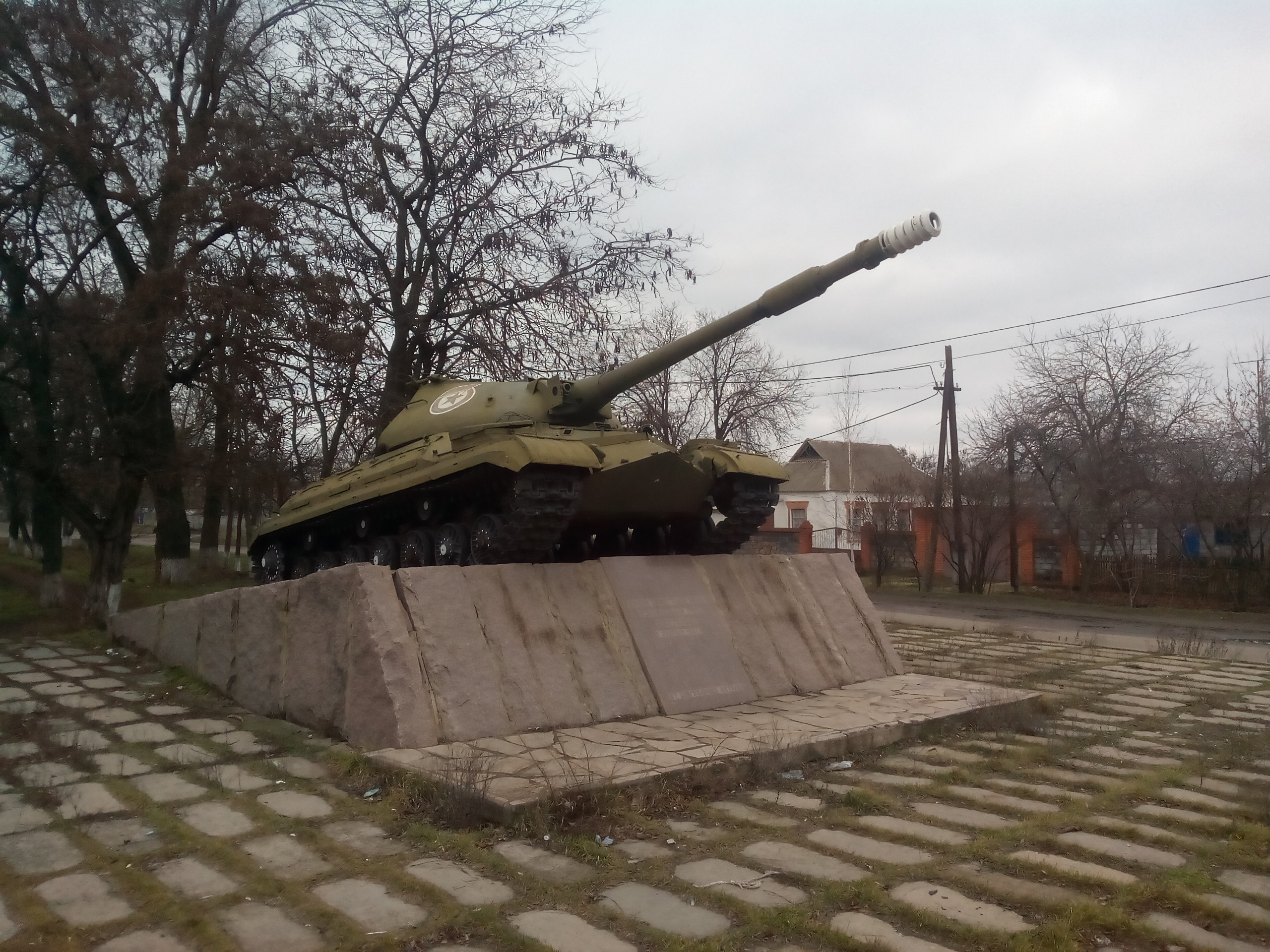Тяжелый танк «ИС-2» установлен в благодарность танковым соединениям, освобождавшим территориию Никополя от немецко-фашистских захватчиков. С левой стороны на приставной стеле укреплено рельефное изображение отлитой из бронзы медали «Золотая Звезда» Героя Советского Союза. На основной стеле выгравирован текст:
