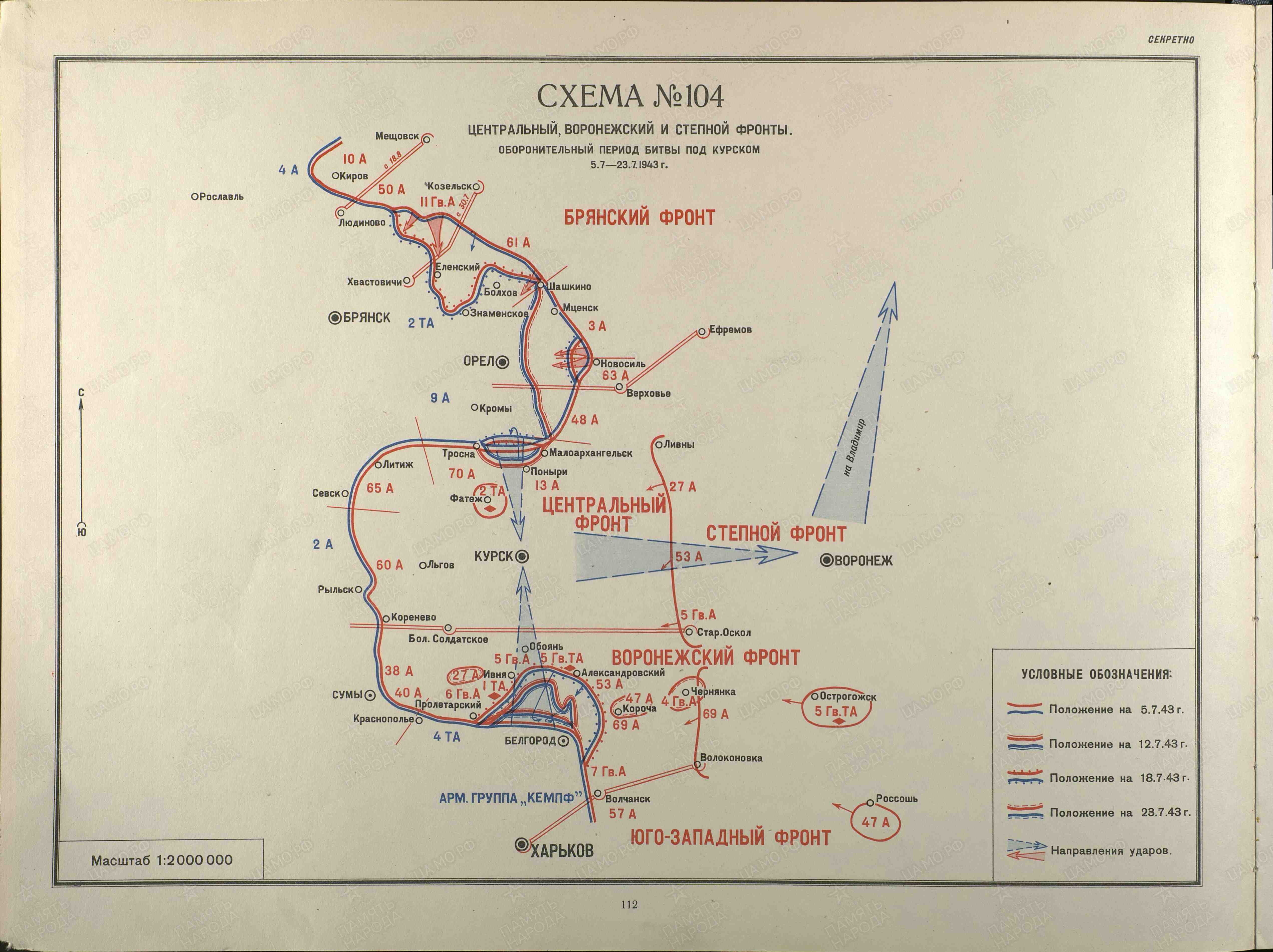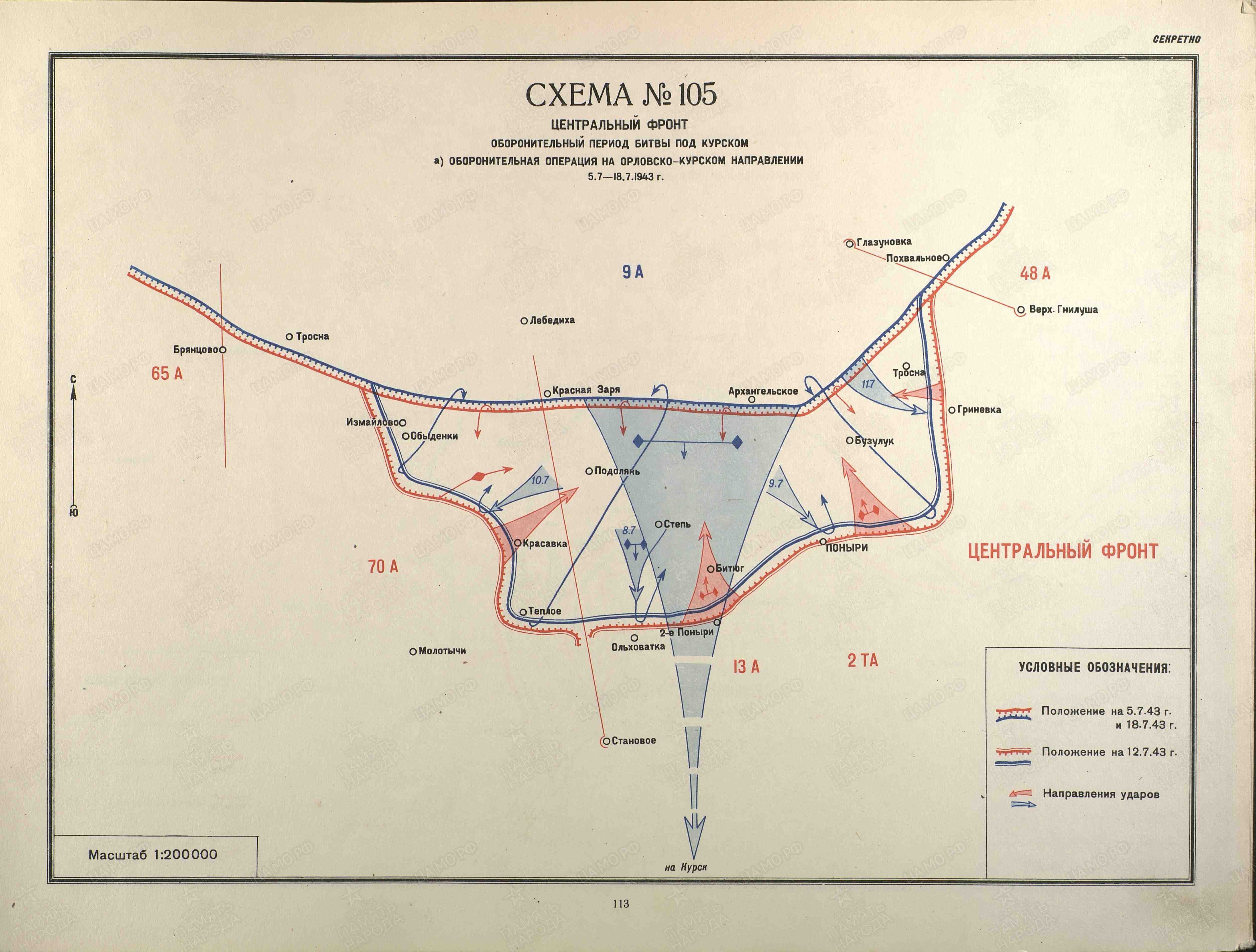 Противник из района южнее Кромы нанес удар в направлении на Курск и к 10.7.43 г. вклинился в оборону на глубину 6-15 км. Стойкой, активной и глубоко эшелонированной обороной войска 13, 70 А и 2 ТА остановили наступление противника на Курск, а затем сами нанесли контрудар и к 18.7.43 г. восстановили прежнее положение. 5 июля противник крупными силами перешел в наступление на Курск с юга. В ходе боев он расширил прорыв до 50-60 км по фронту и до 35 км в глубину. Последовательными контрударами советские войска к 18.7.43 г. остановили наступление противника, а к 23.7.43 г. восстановили первоначальное положение