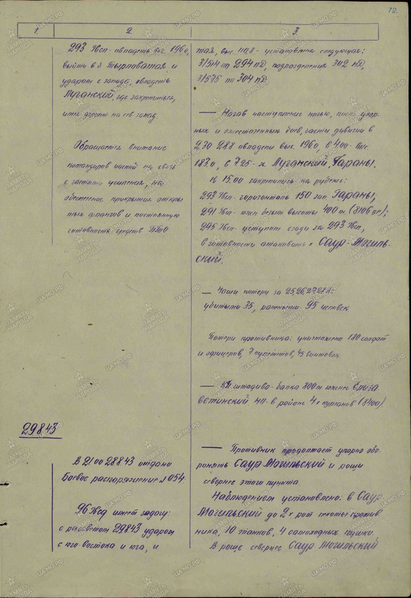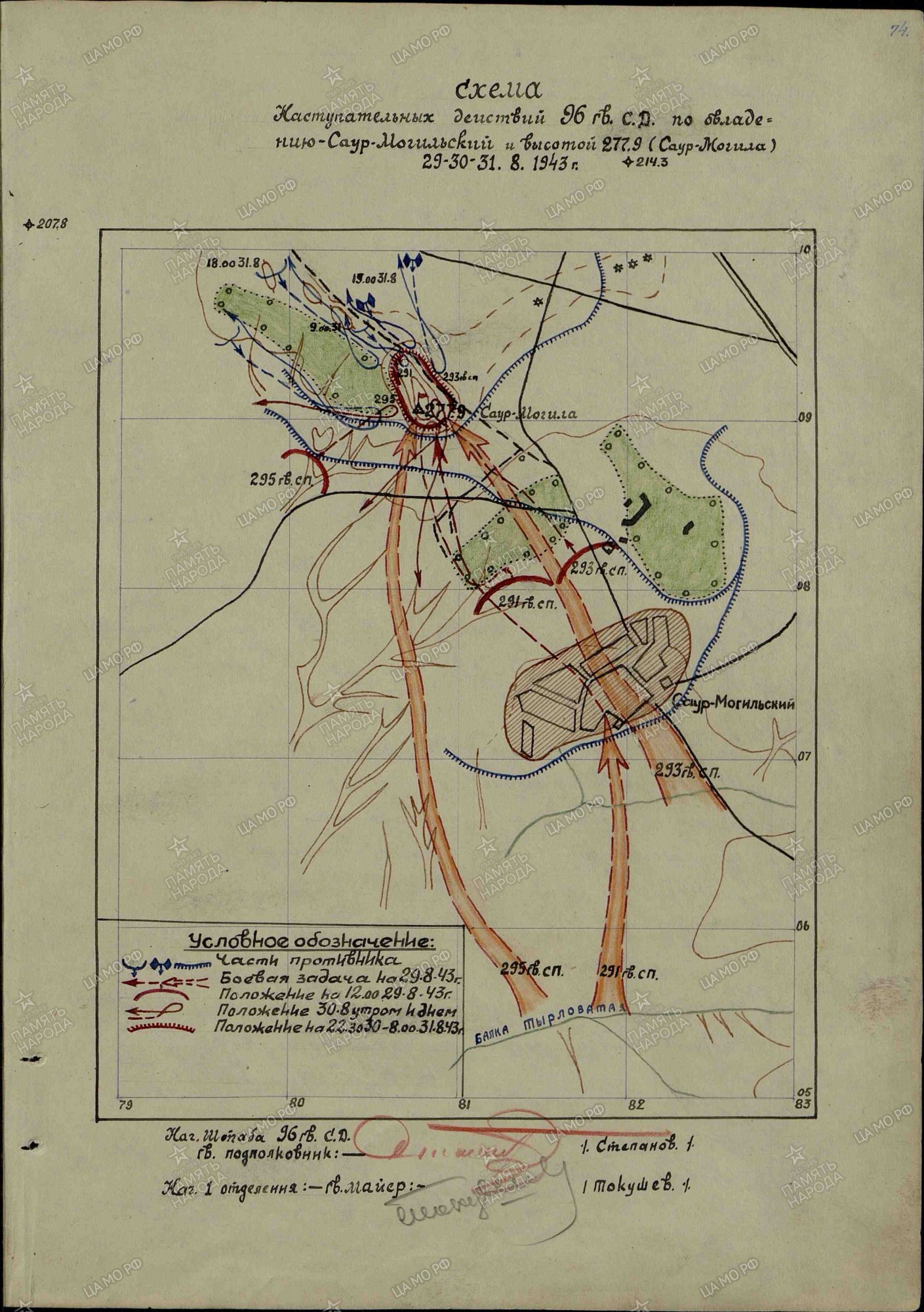 Начав наступление ночью, после упорных и ожесточенных боев, части дивизии в 230 288 овладели выс.196 и, в 4.00 - выс.183 и, в 7.25 - х.Луганский, Тараны… К моменту (29.8.43) наступления дивизия имела количество активных штыков стрелков - 500, пулеметчиков - 64, автоматчиков - 104, бронебойщиков - 126, артиллеристов - 799, минометчиков - 299. Наши потери: убито 9, ранено 44 человека. Потери противника: уничтожено - 85 солдат и офицеров, 25 винтовок, 5 пулеметов, 6 автоматов...Принять все необходимые меры боевого обеспечения на ночь. Взять под личный контроль командиров частей организацию питания личного состава и подвоз боеприпасов, эвакуацию раненых, а также организацию похорон убитых бойцов и офицеров... В 11.00, в результате контратаки противника (6 танков и 100 автоматчиков), части дивизии отошли на рубеж: 293 Гвсп - (0880г); 291Гвсп (0880 а); 295 Гвсп - (0980 в-0880 а) где и закрепились в готовности повторить атаку выс.Саур.Могила. В 20.30 части дивизии штурмом вновь овладели пиком выс.277.9 (Саур Могила).