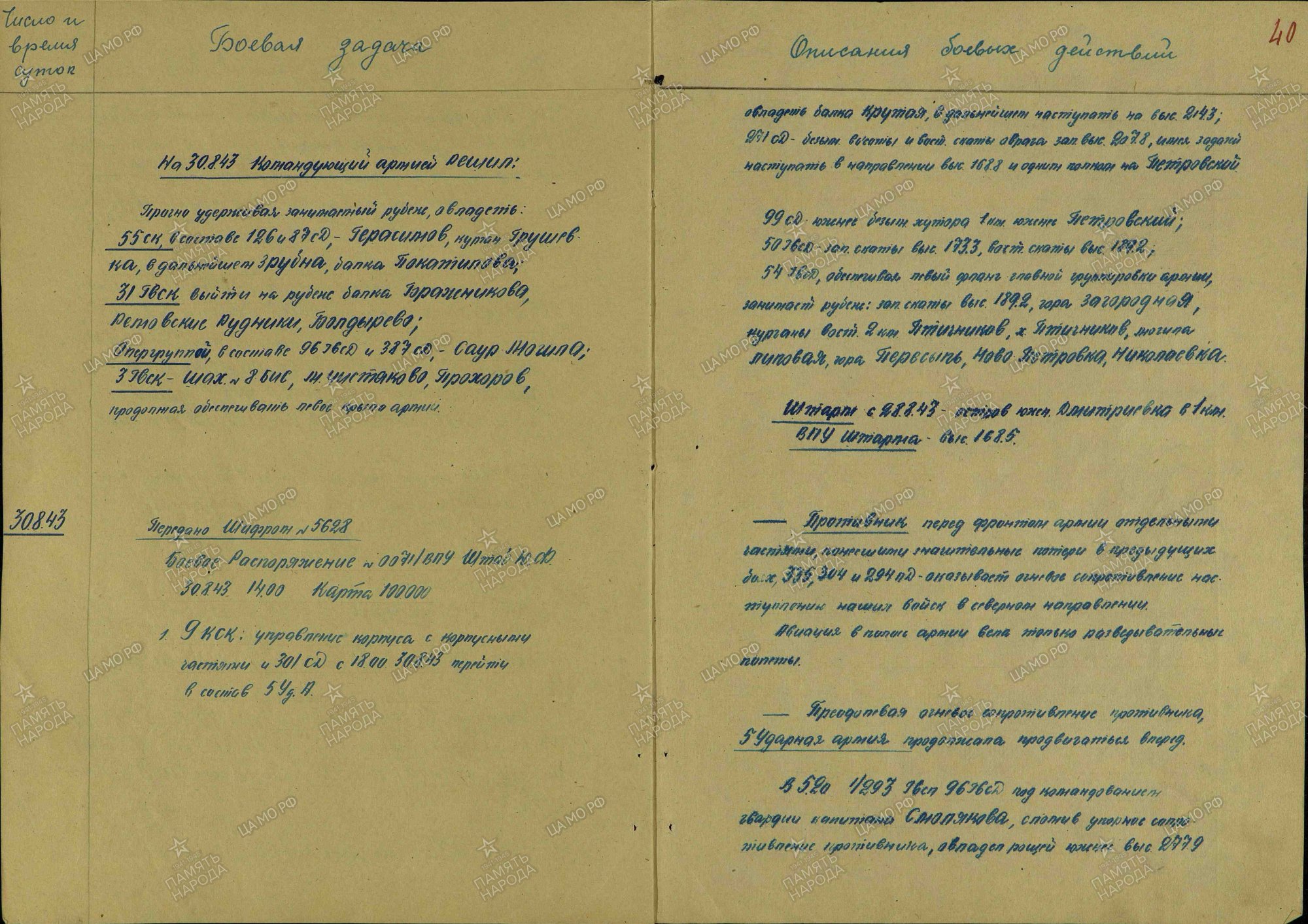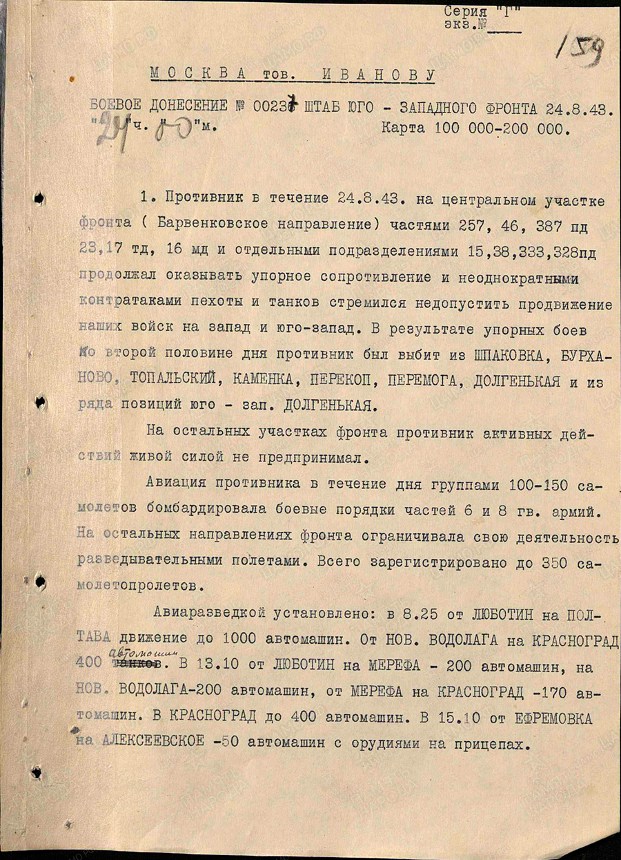 На 30.8.43 Командующий армией решил: Прочно удерживая занимаемый рубеж, овладеть: 55 ск, в составе 126 и 87 СД, - Герасимов, курган Грушевка, в дальнейшем Зрубна, балка Покатилова; 31 Гвск выйти на рубеж балка Гаражникова, Ремовские Рудники, Болдырево; Опергруппой, в составе 96 ГвСД и 387 СД, - Саур Могила; 3 Гвск - шах.№8БИС, м.Чистаково, Прохоров, продолжая обеспечивать первое крыло армий....Противник перед фронтом армии отдельными частями, понесшими значительные потери в предыдущих боях, 335, 304 и 294 ПД - оказывает огневое сопротивление наступлений наших войск в северном направлении.