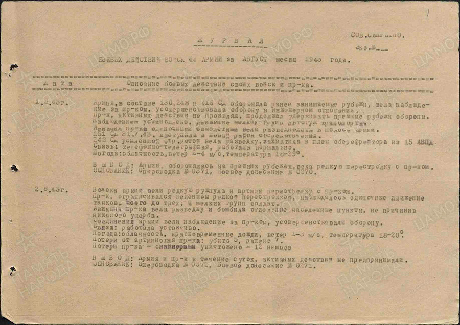 29.8.43г. Вывод: Армия, преодолевая сильное огневое сопротивление пр-ка, медленно продвигалась вперед. Пр-к, цепляясь за высоты и населенные пункты, оказывал упорно сопротивление. Основание: оперсводка № 0399. Боевое донесение №0298…. 30.8.43г. Вывод: Части армии, преследуя пр-ка, в 7.00. передовыми отрядами ворвались в гор.Таганрог и освободили его. Пр-к, оказывая огневое сопротивление, на отдельных рубежах, отходит в Западном направлении. Основание: Оперсводка №0400, Боевое донесение №0299.