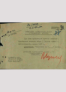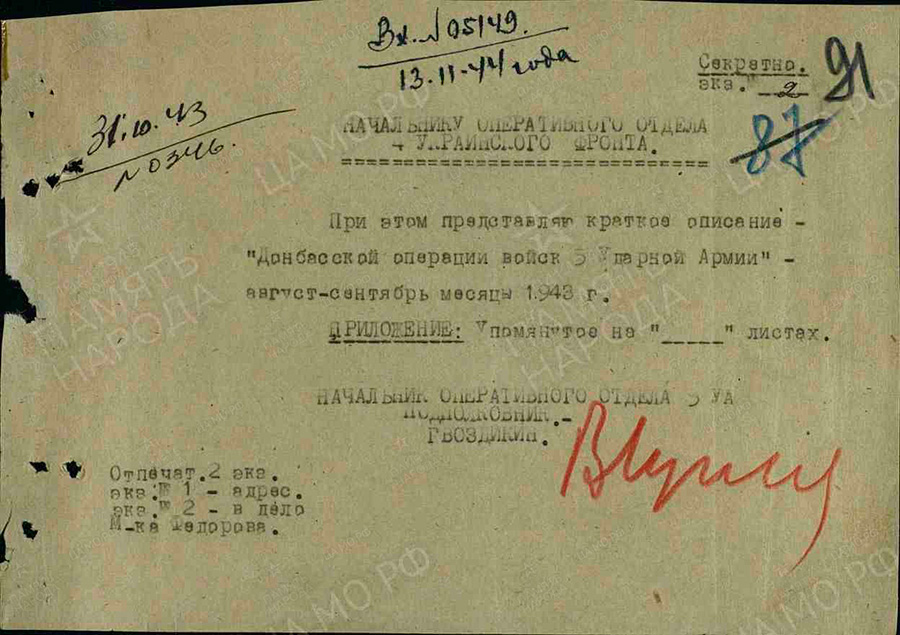Полковнику Левину. Всем командирам корпусов и дивизий. Военный Совет 5 Ударной Армии поздравляет Вас, весь офицерский, сержантский и рядовой состав 96ГВ СД со взятием твердыни немецкой оборонительной полосы - выс.277.9/Саур-Могила/и входит в ходатайство перед военным Советом Южного фронта о награждении полковника Левина орденом Красного Знамени. Всех достойных офицеров, сержантов и рядовых наградит орденами и медалями, вручив им знаки на выс.277.9. Вечная память героям, погибшим за счастье нашей Родины! Смерть немецким оккупантам
