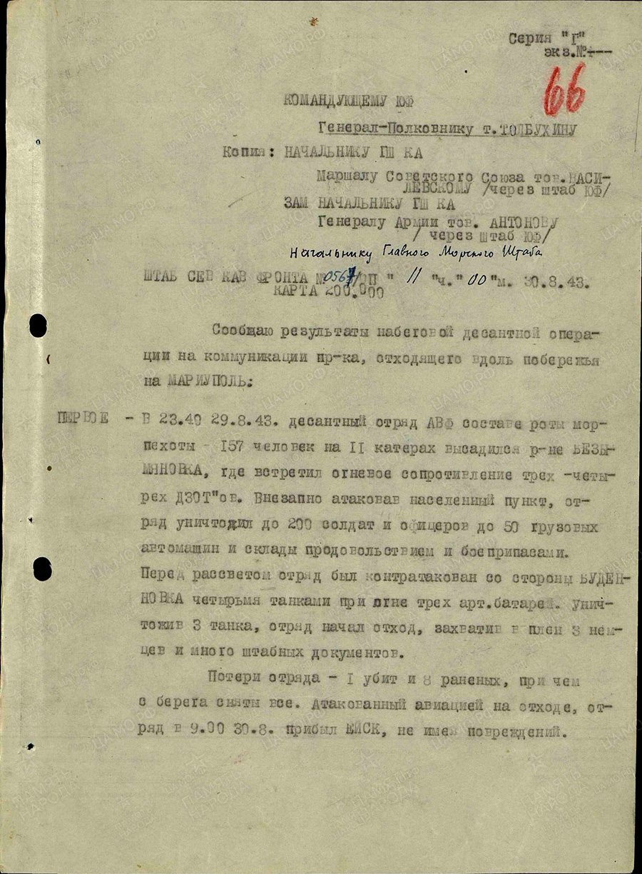 Внезапно атаковав населенный пункт, отряд уничтожил до 200 солдат и офицеров до 50 грузовых автомашин и склады с продовольствием и боеприпасами. Перед рассветом отряд был контратакован со стороны Буденновка четырьмя танками при огне трех арт.батарей. Уничтожив 3 танка, отряд начал отход, захватив в плен 3 немцев и много штабных документов. Потери отряда - 1 убит и 8 раненых, при чем с берега сняты все. Атакованный авиацией на отходе, отряд в 9.00 30.8 прибыл в Ейск, не имея повреждений...Пятое - мною приказано: командующему АВФ подготовить вторую набеговую десантную операцию более крупного масштаба с действиями в ночь на 1.9.43.