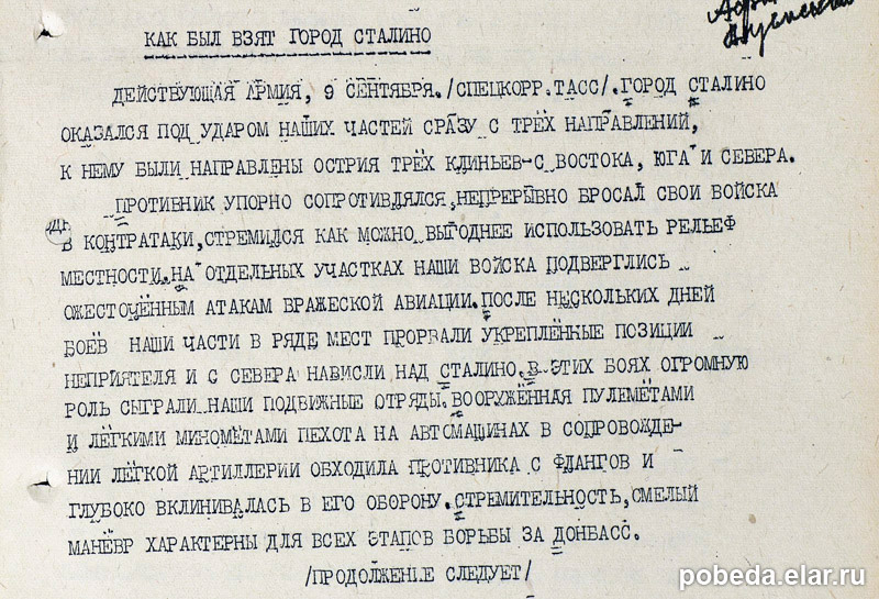 28 и 29 августа 1943 года войска армии вели наступательные бои за овладение отдельными опорными пунктами противника и ломая сопротивление его заняли: Степановка, Саур-Могильский, выс.230.9, Птичников, гора Пересыпь и другие. …Успешно выполненный в ходе боя сложный маневр войск 31 гв ск и маневр ударных сил и средств армии к своему левому флангу создали выгодную обстановку штурма города Сталино...Днем и ночью, преследуя отходящего противника ...войска 5 УА с неослабевающим темпом очищали западный край...кряжа западнее Сталино и к 10.9.43 вышли на рубеж р.Сухие Ялы, тем самым начав борьбу за левобережную Украину...IV. Итоги Донбасской операции. Донбасская операция войск 5 Ударной армии, длившаяся 32 дня, является законченной армейской операцией войск, насыщенных всеми видами современной техники. Она включала в себя бои по прорыву сильной обороны немцев "Миус-фронт", сложные бои по расширению прорыва, ввод в прорыв подвижной группы, бои на промежуточных рубежах, штурм крупных промышленных городов Донбасса, преследование отходящего противника и встречные бои передовых отрядов...В проведенных боях войска 5 Ударной армии уничтожили до 80000 и взяли в плен 1347 немецких солдат и офицеров. Разгромлены 258, 294, 306 пд, 13,17 тд и уничтожены полностью четыре батальона изменников родины. Захвачены большие трофеи, в том числе орудий всех калибров 181, минометов 187, пулеметов 398, танков 11, автомашин 117, около 1000 вагонов, 8 паровозов, 2 самолета, 26 мотоциклов и 650 лошадей.Уничтожено орудий 491, минометов 232, пулеметов 2058, танков 263, бронемашин 21, автомашин 485, самолетов 42.