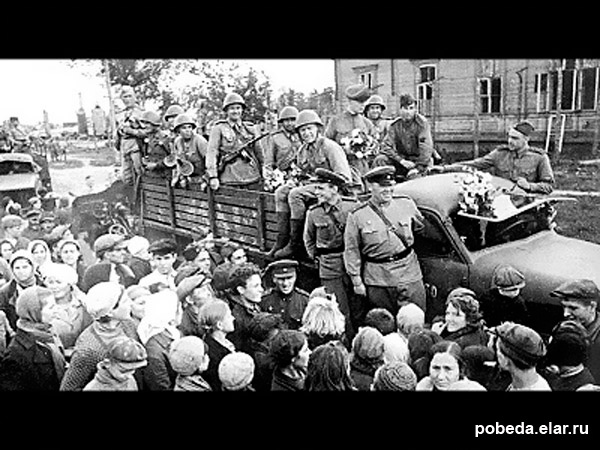 Навстречу наступающим частям Кр.армии идет непрерывный поток мирных жителей, которым удалось, рискуя жизнью, убежать от немцев и спрятаться в кукурузе, болоте, ямах.