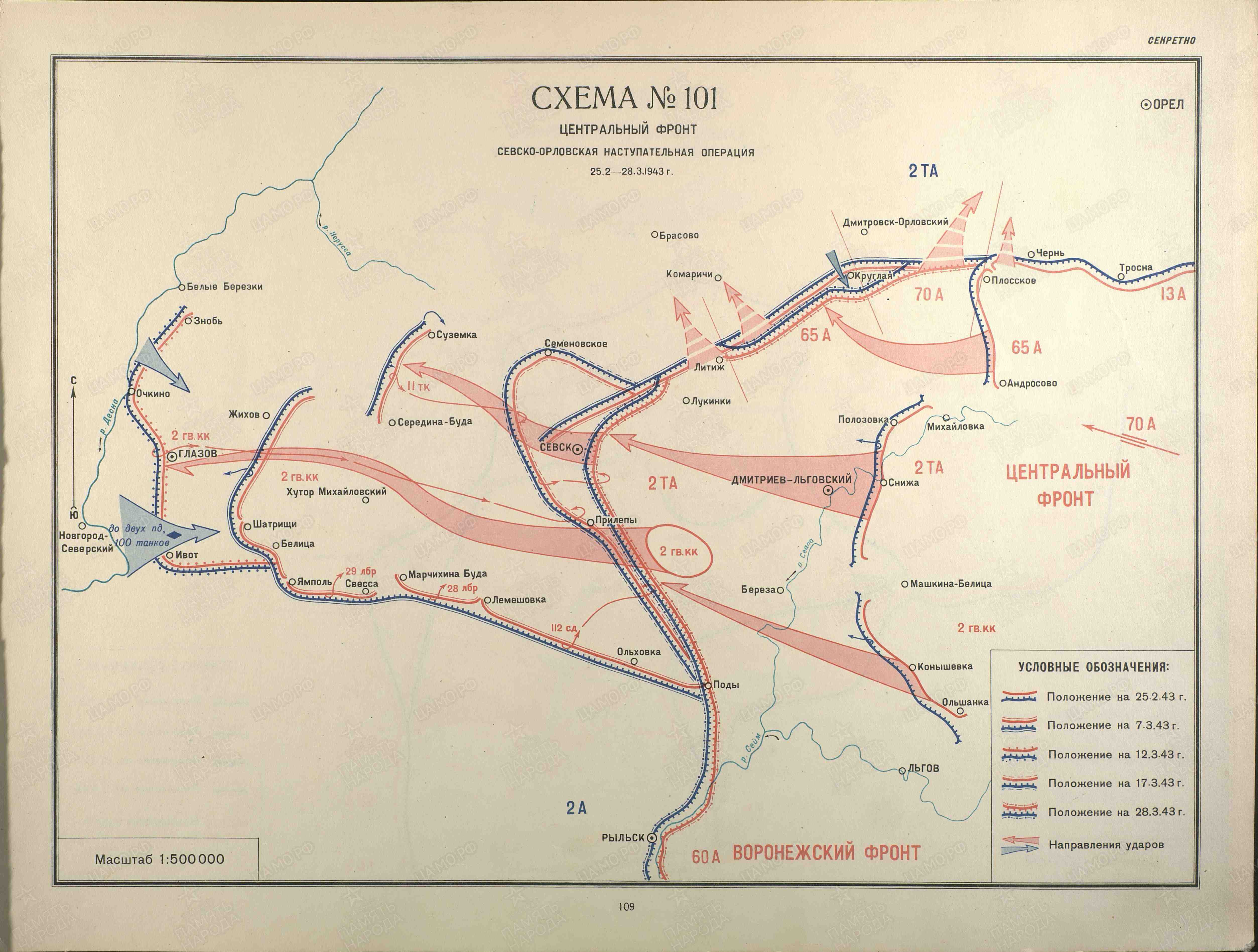Наступление Центрального фронта на г. Орел с юга успеха не имело. Левое крыло фронта продвинулось на 150 км и частями 2-го гвардейского кавалерийского корпуса к 12.3.43 г. вышло на р. Десна на участке Знобь, Очкино, Глазов, Ивот и далее на восток до Поды. Под нажимом противника части 2-го гвардейского кавалерийского корпуса отошли обратно на восток. 28.3.43 г. противник был остановлен на рубеже восточнее г. Севск, где фронт стабилизировался до июля 1943 г.