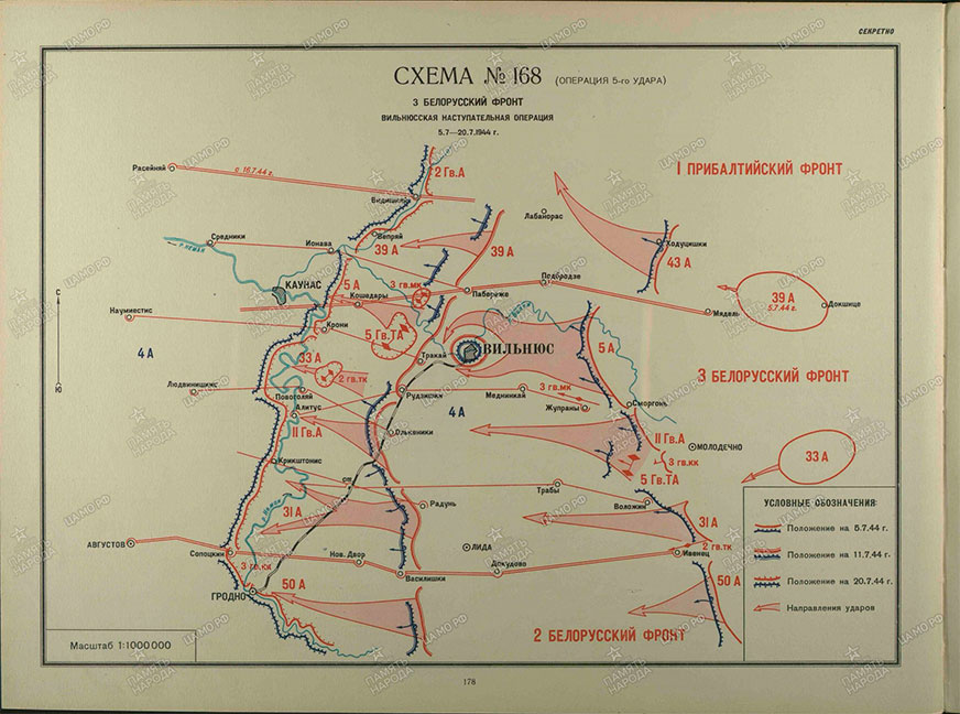 Войска фронта, продвинувшись до 210 км, освободили города Вильнюс, Лида, вышли на р. Неман и, форсировав ее на фронте 70 км, захватили плацдарм на западном берегу