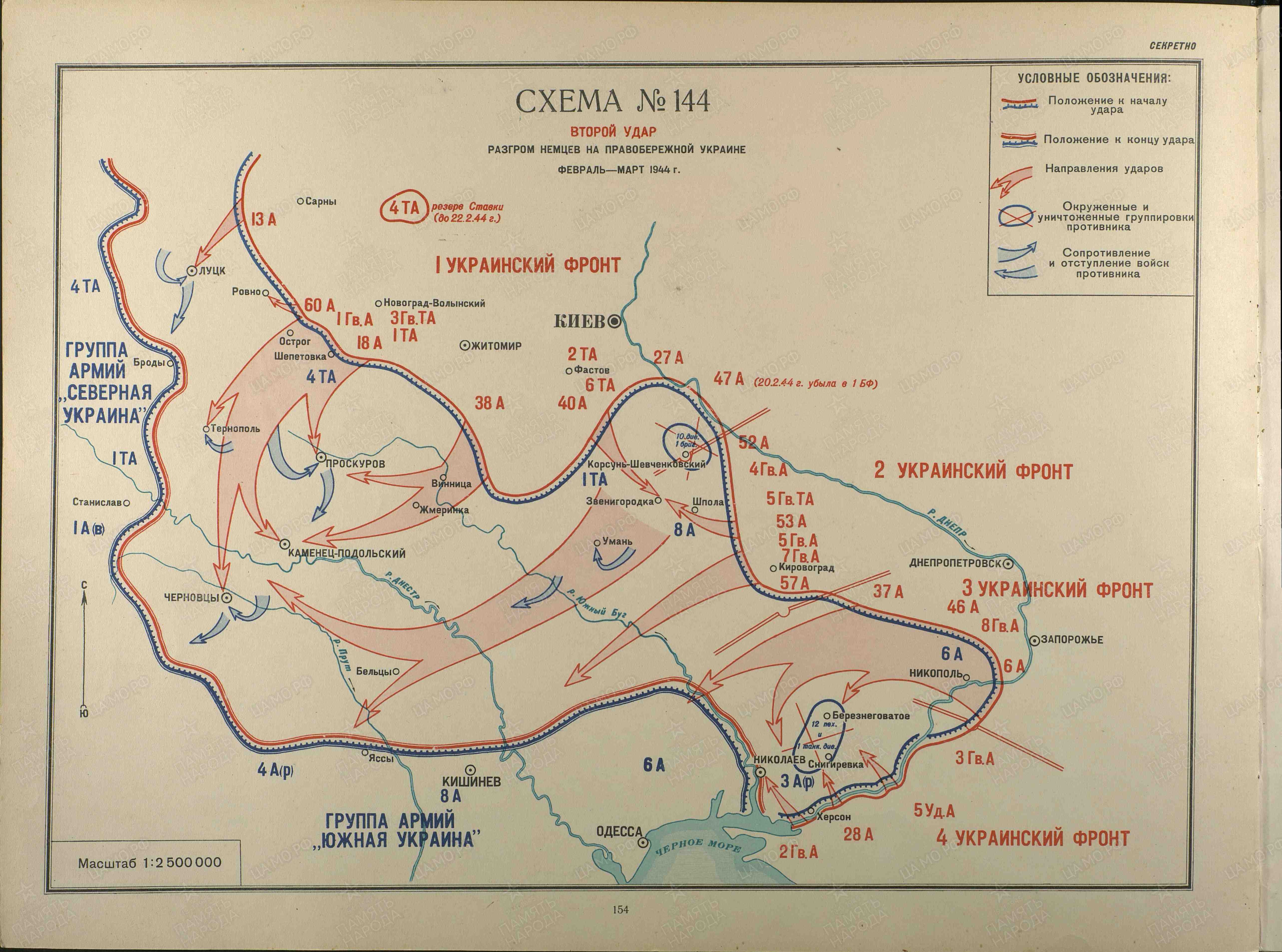 Советские войска нанесли большие потери 1 и 4 ТА, 8 и 6 армиям немцев и 3 армии румын. Разгромлены корсунь-шевченковская и никопольская группировки противника. Освобождена Правобережная Украина. Созданы условия для полного изгнания немцев из Украины и Белоруссии
